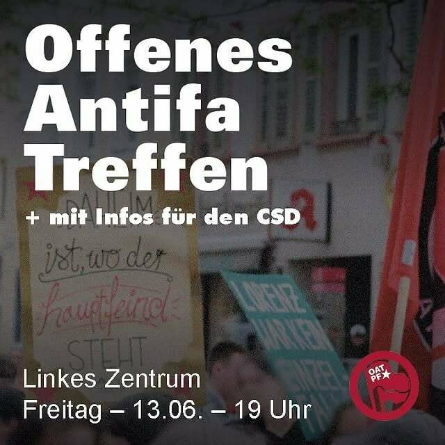 Am Freitag ist wieder OAT bei uns! Komm vorbei, wenn du Bock hast hier in Pforzheim gegen Nazis und andere Rechte aktiv zu werden! Diesen Freitag reden wir zusätzlich auch noch über den Ablauf des Pforzheimer CSDs dieses Jahr. Schreib uns einfach eine DM oder Mail!