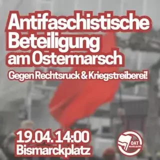 Kommt deshalb alle am 19.04. mit uns zum Ostermarsch, um gegen Rechtsruck, Aufrüstung und Kriegstreiberei zu demonstrieren.