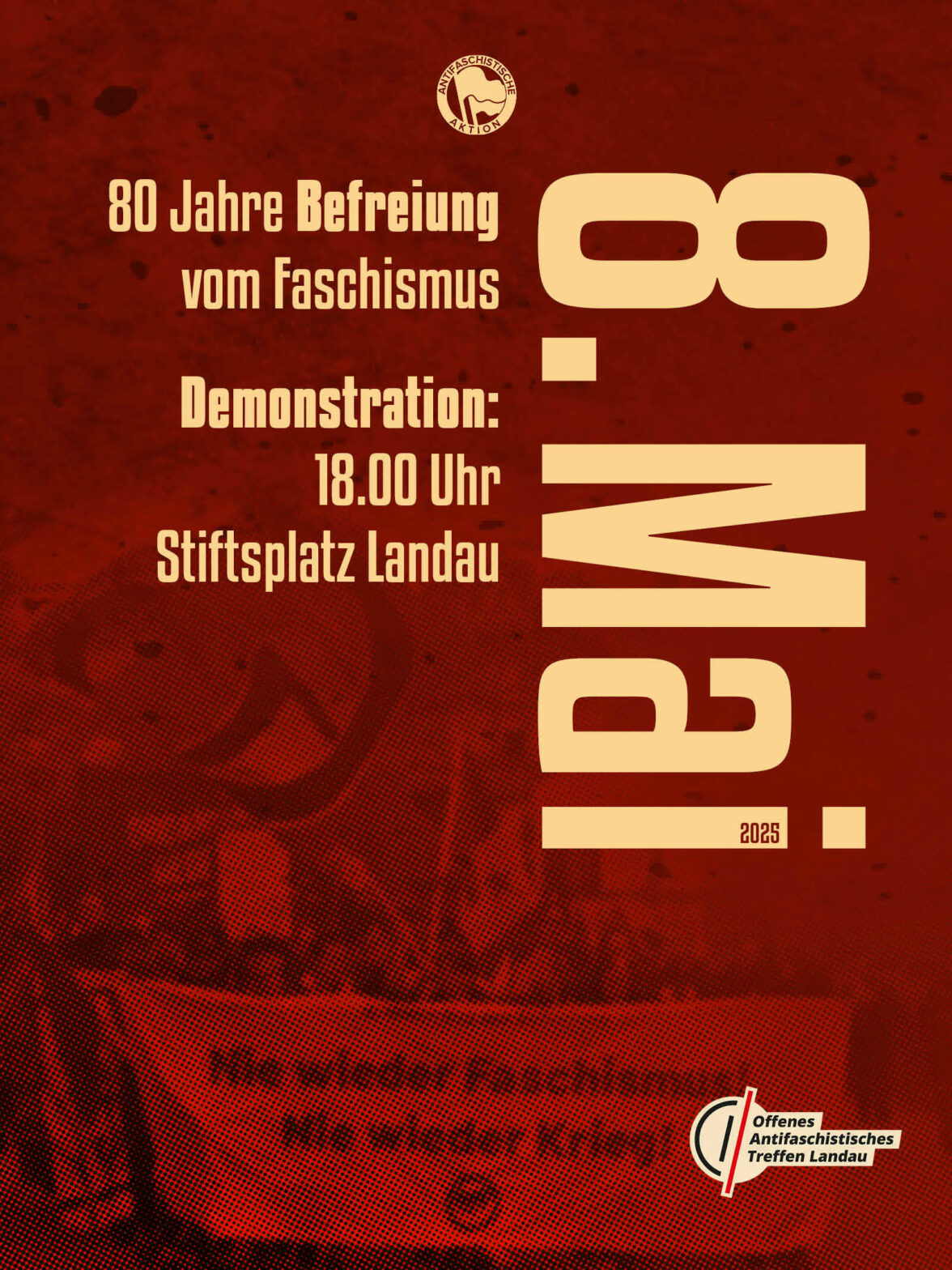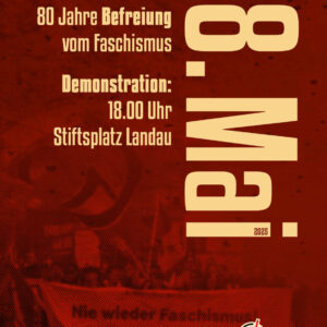 Kommt zur Demonstration am 8. Mai um 18:00 Uhr auf dem Stiftsplatz in Landau. Nach Ende der Demo wird noch ein Kulturangebot im Linken Zentrum Kätche Brunner (Vogesenstraße 34) stattfinden.