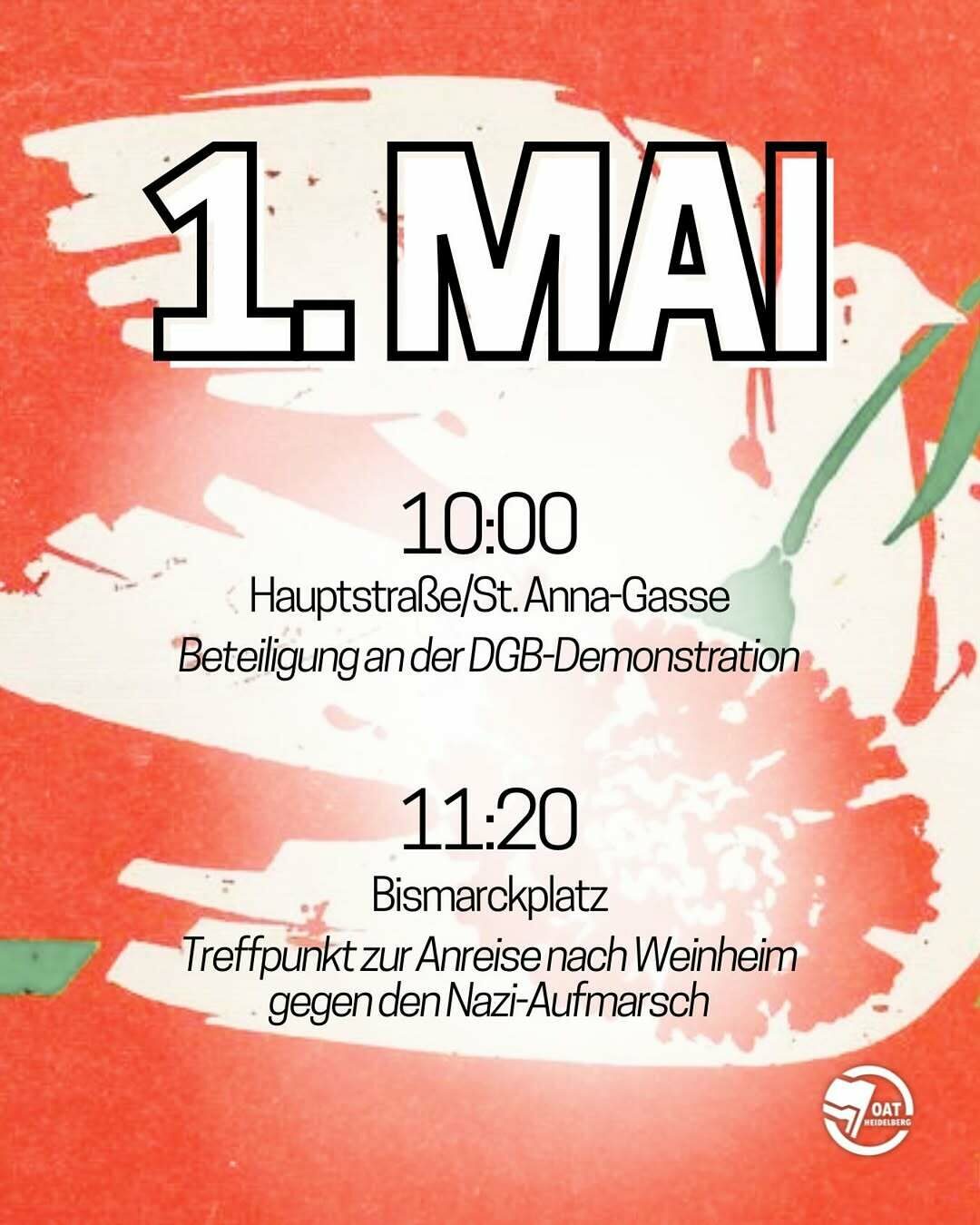 😡 Doch auch Neonazis haben sich für den 1. Mai angekündigt und rufen zum “Tag der Deutschen Arbeit”auf – in Anlehnung die Entstellung des Feiertages im Nationalsozialismus, während dem jeglicher Klassenkampf brutal unterdrückt, Gewerkschaften ausgeschaltet und politische Gegner:innen ermordet wurden. Die NPD und die Kameradschaft Rheinhessen wollen am 1. Mai in Weinheim demonstrieren. Wir werden den Gegenprotest dort unterstützen und treffen uns um 11:20 am Bismarckplatz, um gemeinsam mit der Straßenbahn nach Weinheim zu fahren.