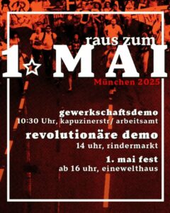 Wir werden nicht dabei zuschauen, wie sich die Herrschenden die Welt unter sich aufteilen – dafür Krieg und Elend in Kauf nehmen. Jetzt ist die Zeit aktiv zu werden und sich zu wehren, weil es niemand für uns machen wird. Niemand vertritt uns in unseren Interessen – keine Parteien, keine NGOs. Selbst in den Gewerkschaften müssen wir energisch dagegen kämpfen, dass Regierungspolitik gemacht wird. Sich zusammenschließen, Kämpfe und Solidarität organisieren, ist die einzige Antwort auf die kapitalistische Krise, die für uns in Frage kommt. Es wird unbequem und es wird Rückschläge geben. Aber es gab in jüngster Zeit auch Kämpfe, die aufgezeigt haben,dass Hartnäckigkeit und solidarisches Handeln was bewirken können. In München konnte im Winter 2020/21 durch Proteste von Gewerkschafter:innen ein Einstellungsstopp im öffentlichen Dienst verhindert werden, in Berlin verhinderten Proteste in den letzten Monaten die Einführung des Sparhaushaltes: Es sind die kleinen Kämpfe, die uns beweisen, dass organisierter Widerstand erfolgreich sein kann. Der 1. Mai ist seit 150 Jahren ein Symbol für den kontinuierlichen Kampf der arbeitenden Klasse gegen Ausbeutung und Unterdrückung. Es geht dabei nicht nur um die Kämpfe gegen die vielen Verschlechterungen und um kleine Verbesserungen, sondern gerade an diesem Tag auch um die große Perspektive: Wenn wir eine Chance haben wollen auf gerechten Frieden, ein freies Leben für alle, eine klassenlose Gesellschaft, eine nachhaltige Wirtschaft, die nicht auf Profiten basiert – dann müssen wir für den Sozialismus kämpfen. Hier und jetzt. Fangen wir an!