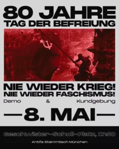 80 Jahre nach dem Ende des 2. Weltkriegs – nach der Befreiung vom deutschen Faschismus – scheinen die Lehren von damals vergessen. Erneut sollen Arbeiter:innen für die Profite der heimischen Kapitalist:innen verheizt werden. Wer der kriegslüsternen Propaganda widerspricht, wird mundtot gemacht. Wer es gar wagt, gegen den aktuellen Völkermord in Palästina auf die Straße zu gehen, spürt den Polizeiknüppel auf der Haut und darf sich das Pfefferspray aus den Augen wischen.