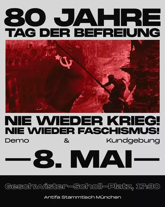 Kommt mit uns am 8. Mai auf die Straße, lasst uns gemeinsam der Roten Armee und den Partisaninnen und Partisanen erinnern, welche den größten Blutzoll zahlten.