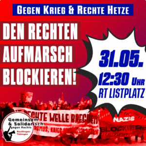 Schließt euch uns am 31.05. an, wenn es darum geht, den rechten Aufmarsch in Reutlingen zu blockieren! Kommt zur Kundgebung mit anschließender Demo ab 12:30 Uhr auf dem Listplatz!