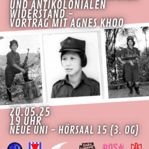 Die Soziologin Agnes Khoo beschäftigt sich mit den Biografien asiatischer Frauen, die gegen Faschismus und Kolonialismus kämpften. 2004 publizierte sie ein Oral-History-Buch über Frauen aus Thailand, Malaysia und Singapur, deren Geschichten von der vorherrschenden Geschichtsschreibung weitgehend unbeachtet bleiben. Sie kämpften im zweiten Weltkrieg in der antifaschistischen Guerilla. Für manche setzte sich ihr Kampf nach 1945 gegen die alte und neue Kolonialmacht Großbritannien nahtlos fort. Die Referentin Agnes Khoo stammt selbst aus Singapur, hat familiäre Beziehungen zu Malaysia und lehrt in China. Ihr Buch von 2004 ist die bislang einzige Monografie über den Widerstand von Frauen gegen den britischen und japanischen Imperialismus in Malaysia und Singapur und dokumentiert ihre vergessenen Opfer im antikolonialen Widerstand über mehr als 50 Jahre. Es erschien bislang in mehreren Auflagen in den Sprachen Englisch und Chinesisch. Zudem hat Agnes Khoo ein Buch über asiatische Freiwillige übersetzt, die im Spanischen Bürgerkrieg in den Internationalen Brigaden gekämpft haben. Derzeit übersetzt sie die Memoiren von Lim Hong Bee (Born Into War) über Folgen des Zweiten Weltkriegs für Malaysia und Singapur.