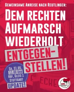 Aus diesem Grund fahren wir am 31. Mai gemeinsam nach Reutlingen und schließen uns den breiten, antifaschistischen Gegenprotesten an.
