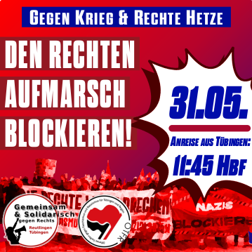 Am 31.05. heißt es in Reutlingen: Gegen Krieg und rechte Hetze – den rechten Aufmarsch verhindern!