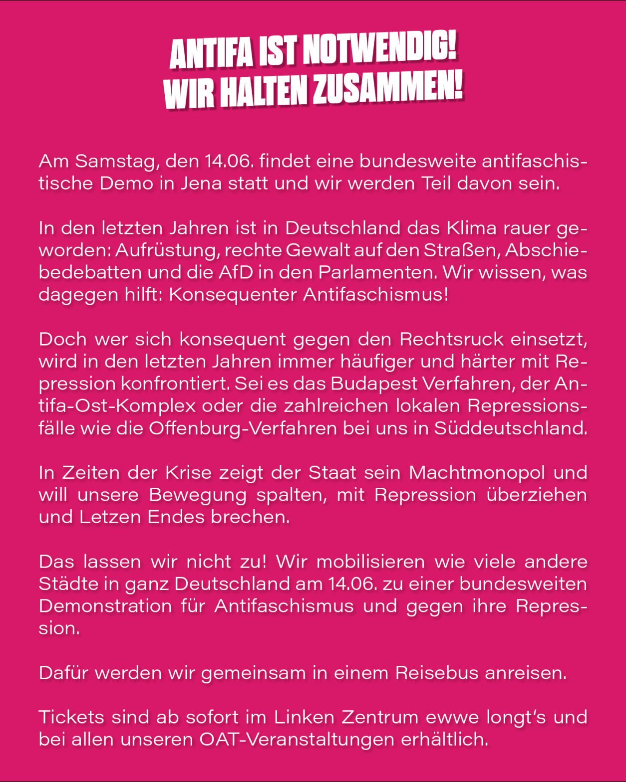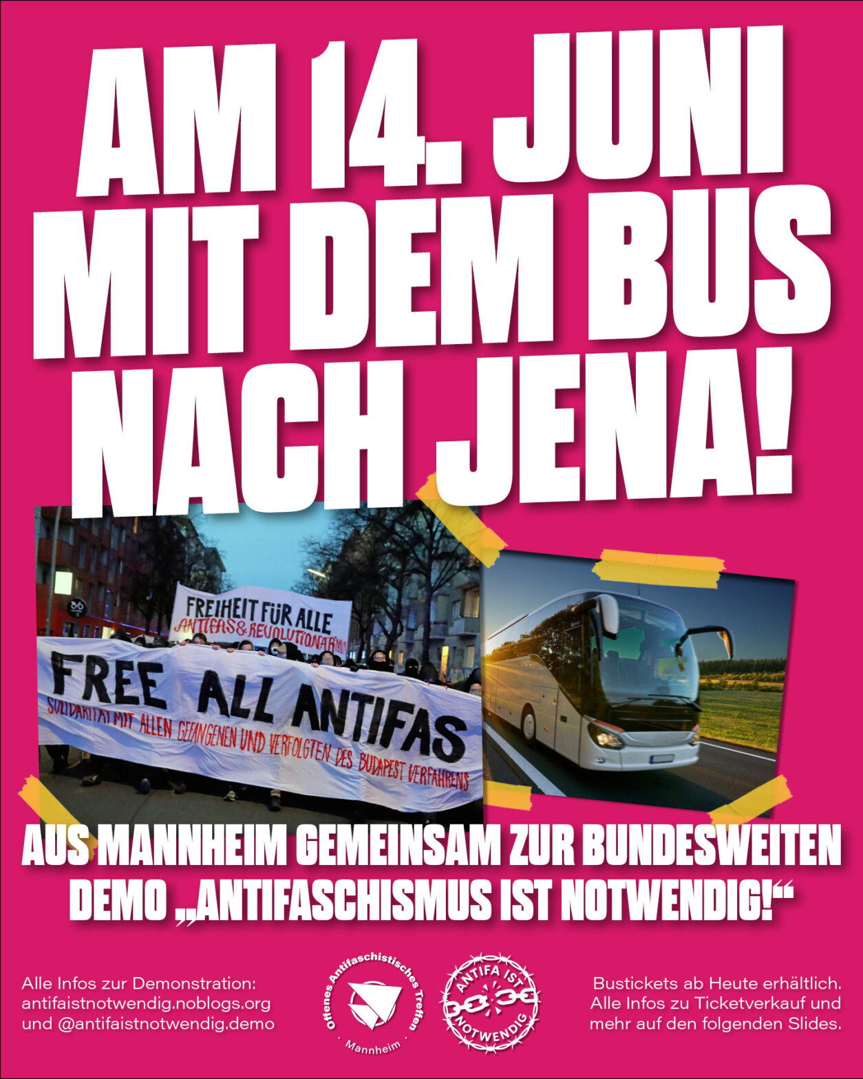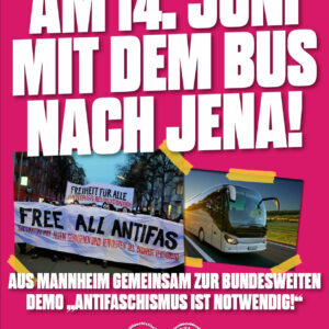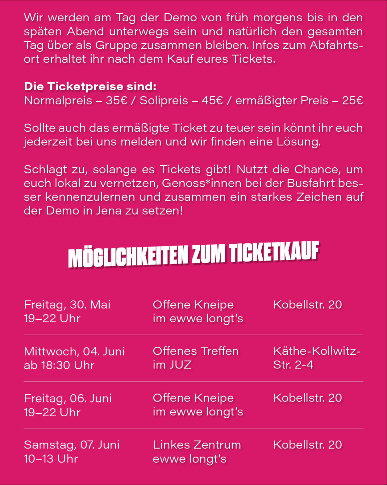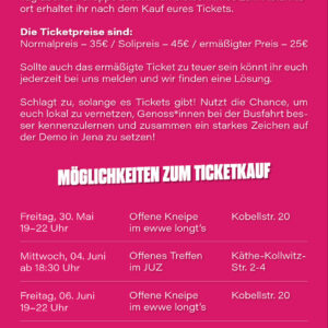 Schlagt zu, solange es Tickets gibt! Nutzt die Chance, um euch lokal zu vernetzen, Genoss*innen bei der Busfahrt besser kennenzulernen und zusammen ein starkes Zeichen auf der Demo in Jena zu setzen!