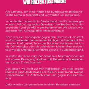 Am Samstag, den 14.06. findet eine bundesweite antifaschistische Demo in Jena statt und wir werden Teil davon sein.