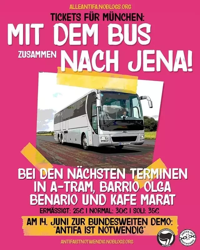 Zur bundesweiten Antirepressions-Demo am 14. Juni fährt ein Bus aus München nach Jena. Unter dem Motto „Antifaschismus ist notwendig! Freiheit für alle Antifaschist*innen!“ wird dort anlässlich der aktuellen Repressionswelle gegen Antifas auf die Straße gegangen. Infos zur Demo findet ihr auf antifaistnotwendig.noblogs.org. Ihr bekommt die Tickets am 4. Juni beim Mobivortrag und bei den kommenden Veranstaltungen in A-Tram, Barrio Olga Benario und Kafe Marat.