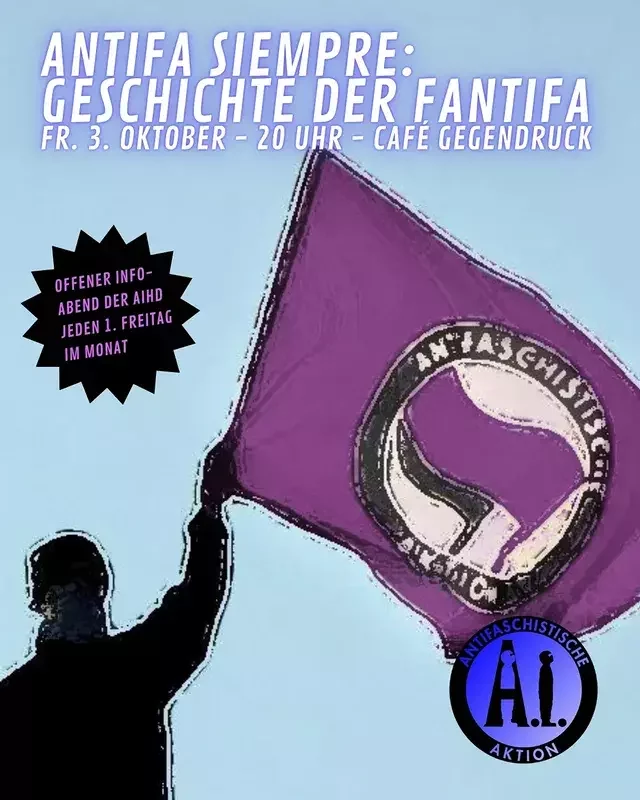 Das Antifa Siempre! will einen Ort für antifaschistische Vernetzung und Austausch für Einzelpersonen und Gruppen schaffen: Nach einem inhaltlichen Input ist Raum für Diskussionen zu aktuellen Themen und bevorstehenden Aktionen. Bei kühlen Getränken lassen wir den Abend gemeinsam ausklingen und wollen miteinander ins Gespräch kommen.