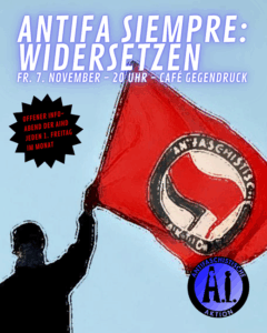 Das Antifa Siempre! will einen Ort für antifaschistische Vernetzung und Austausch für Einzelpersonen und Gruppen schaffen: Nach einem inhaltlichen Input ist Raum für Diskussionen zu aktuellen Themen und bevorstehenden Aktionen. Bei kühlen Getränken lassen wir den Abend gemeinsam ausklingen und wollen miteinander ins Gespräch kommen.