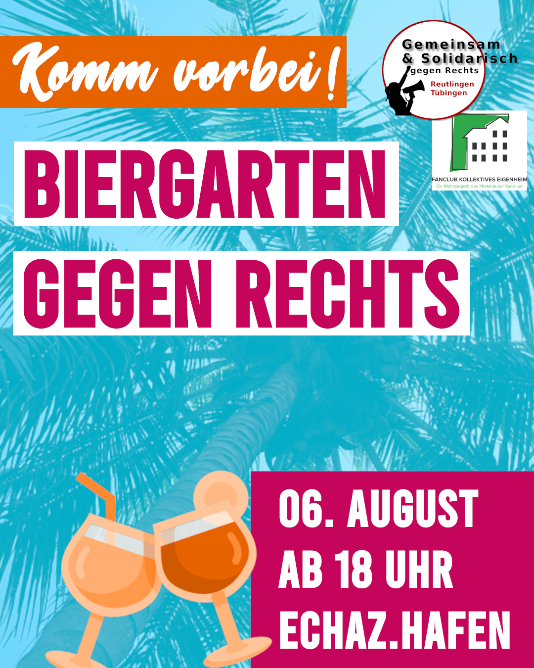 Wir laden euch herzlich zu unserem Biergarten am 6. August ab 18 Uhr im echaz.Hafen in Reutlingen ein. Wir wollen die alljährliche Gelegenheit nutzen, um solidarische Menschen in Reutlingen und Tübingen zu vernetzen und unsere Erfolge im Kampf gegen Rechts und für solidarischen Wohnraum zu feiern!