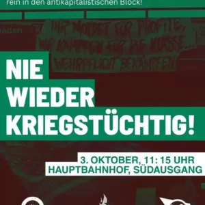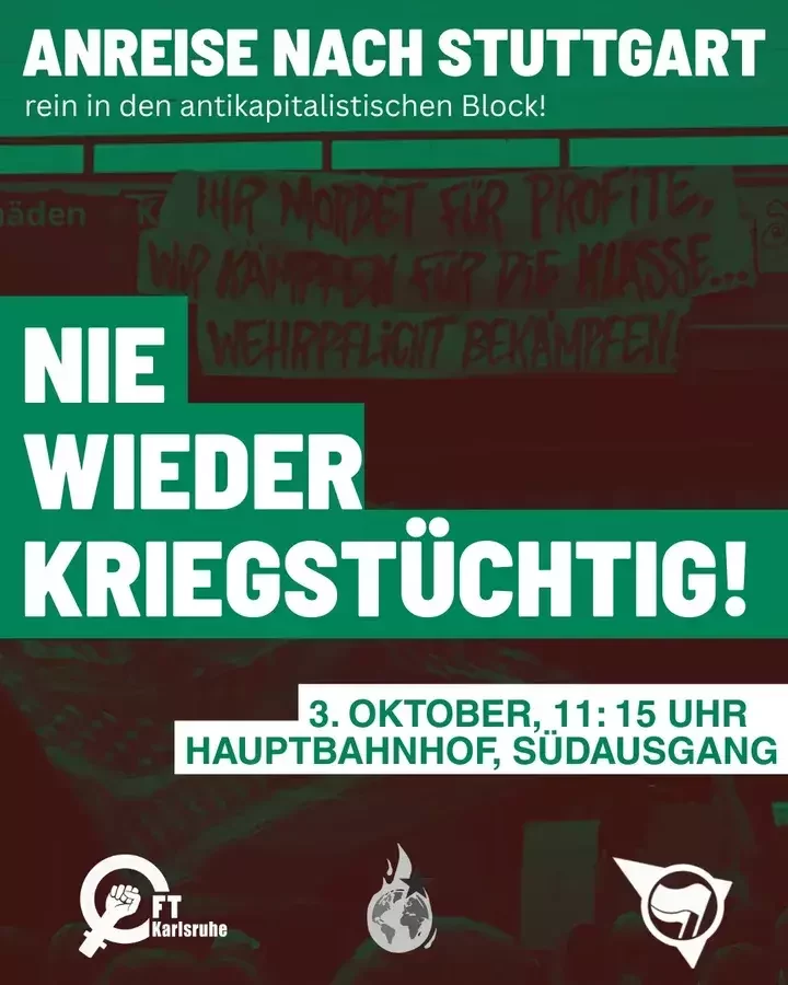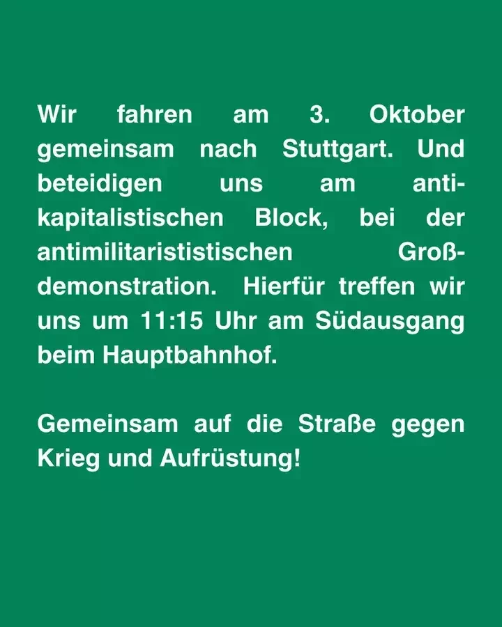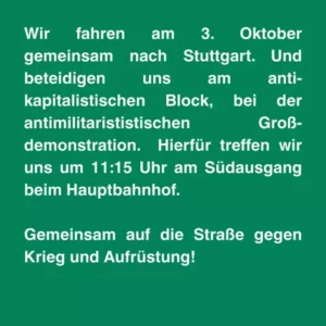 Fahrt mit uns gemeinsam nach Stuttgart zum antikapitalistischen Block bei der antimilitaristischen Großdemonstration.