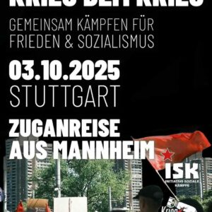 Während weltweit immer mehr Menschen vor Krieg und Zestörung flüchten, verzeichnet das deutsche Kriegskapital wie Rheinmetall, Rekordgewinne. Waffenlieferungen an die Ukraine, Türkei und Israel sind nur ein Teil hiervon, und zeigen aber gleichzeitig, dass das deutsche Kapital kein Interesse an Frieden hat, Statt Geld in Pflege, Krankenhäuser, Bildung und öffentlichen Nahverkehr zu investieren werden durch imperalistische Kriege, Waffenlieferungen und innere Militarisierung Rekordumsätze akkumuliert und weiter von unten nach oben verteilt. Aber das wir es selbst in der Hand haben, die aktuellen Zustände zu verändern, hat die Geschichte nur zu gut gezeigt. Insbesondere in der kapitalistischen Krise eröffnen sich immer wieder Spielräume den Widerspruch zwischen Lohnarbeit und Kapital sichtbar zu machen. In der Krise zeigt sich deutlich die Schere zwischen den herrschenden und die die diese Krise austragen müssen – es sind wir die Arbeiter:innenklasse. Wir werden nicht für die imperialistischen Interessen der Herrschenden in den Krieg ziehen. Lasst uns deshalb gemeinsam als linke Bewegung am 3.10 nach Stuttgart fahren, um ein deutliches Zeichen gegen Krieg, Krise und Militarisierung zu setzen!