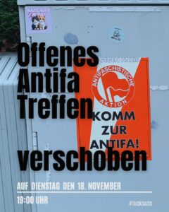 Unser nächstes offene Antifa Treffen findet nicht wie gewohnt am 2. Dienstag im Monat statt sondern am 18.11. weil es um eine Woche nach hinten verschoben wird.