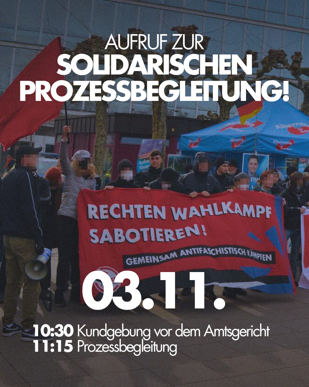 Kommt also am 3. November um 10.30 Uhr zur Kundgebung vor dem Amtsgericht und begleitet im Anschluss im Gerichtssaal den ersten Prozess. Zeigt eure Solidarität!