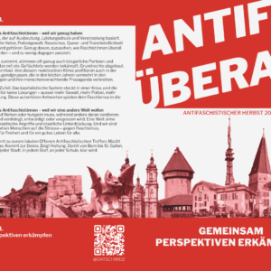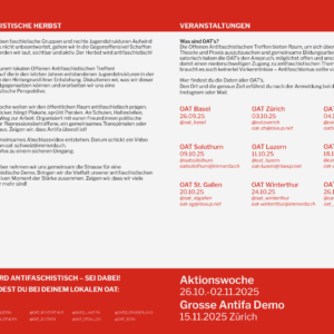 Werdet auch aktiv! Kommt zu eurem lokalen Offenen Antifaschistischen Treffen. Macht mit bei der Aktionswoche. Kommt zur Demo. Zeigt Haltung. Damit von Bern bis St. Gallen, von Basel bis Luzern, in jeder Stadt, in jedem Dorf, an jeder Schule, klar wird: Antifa ist überall!