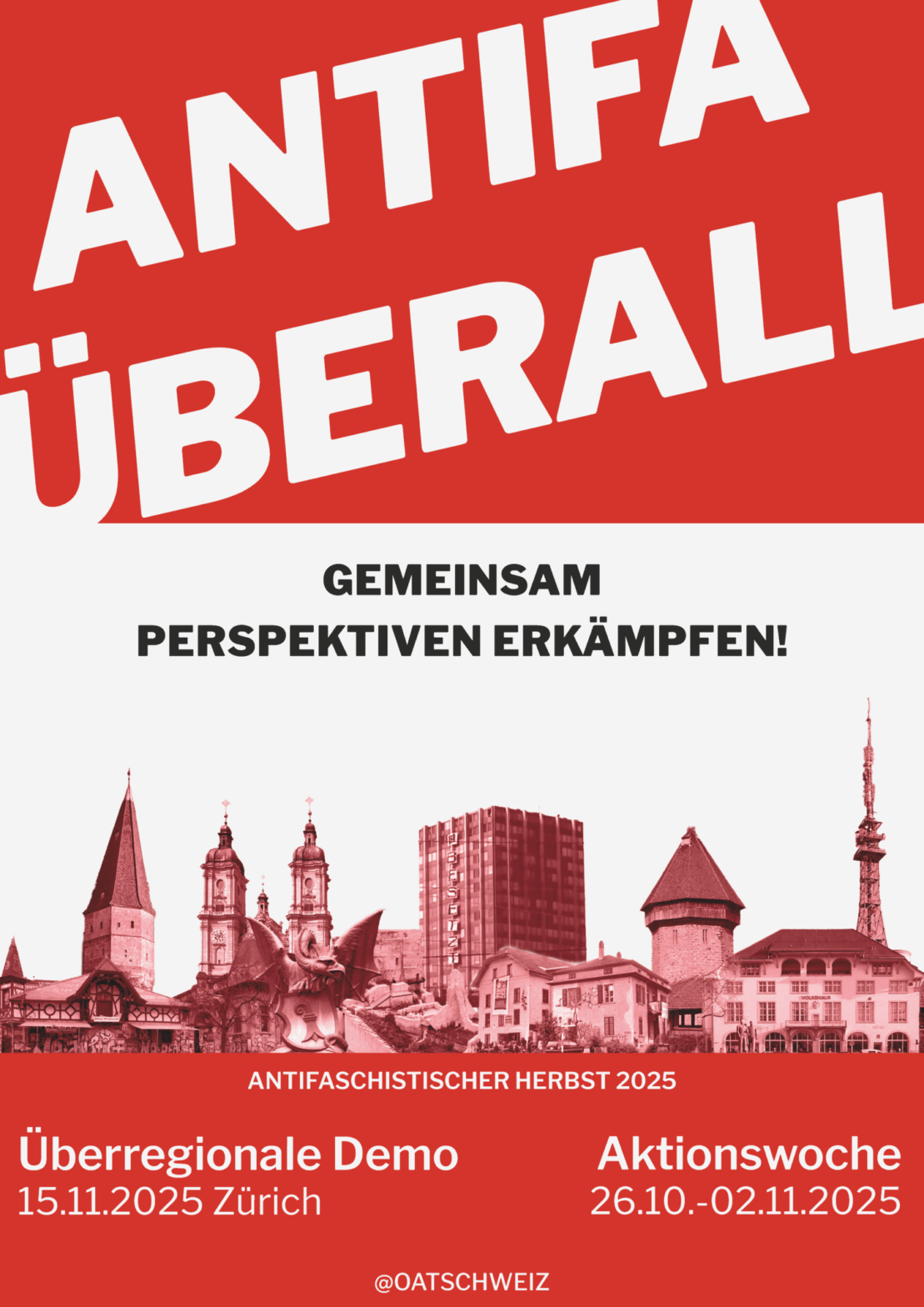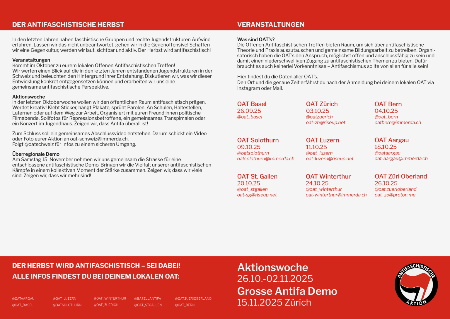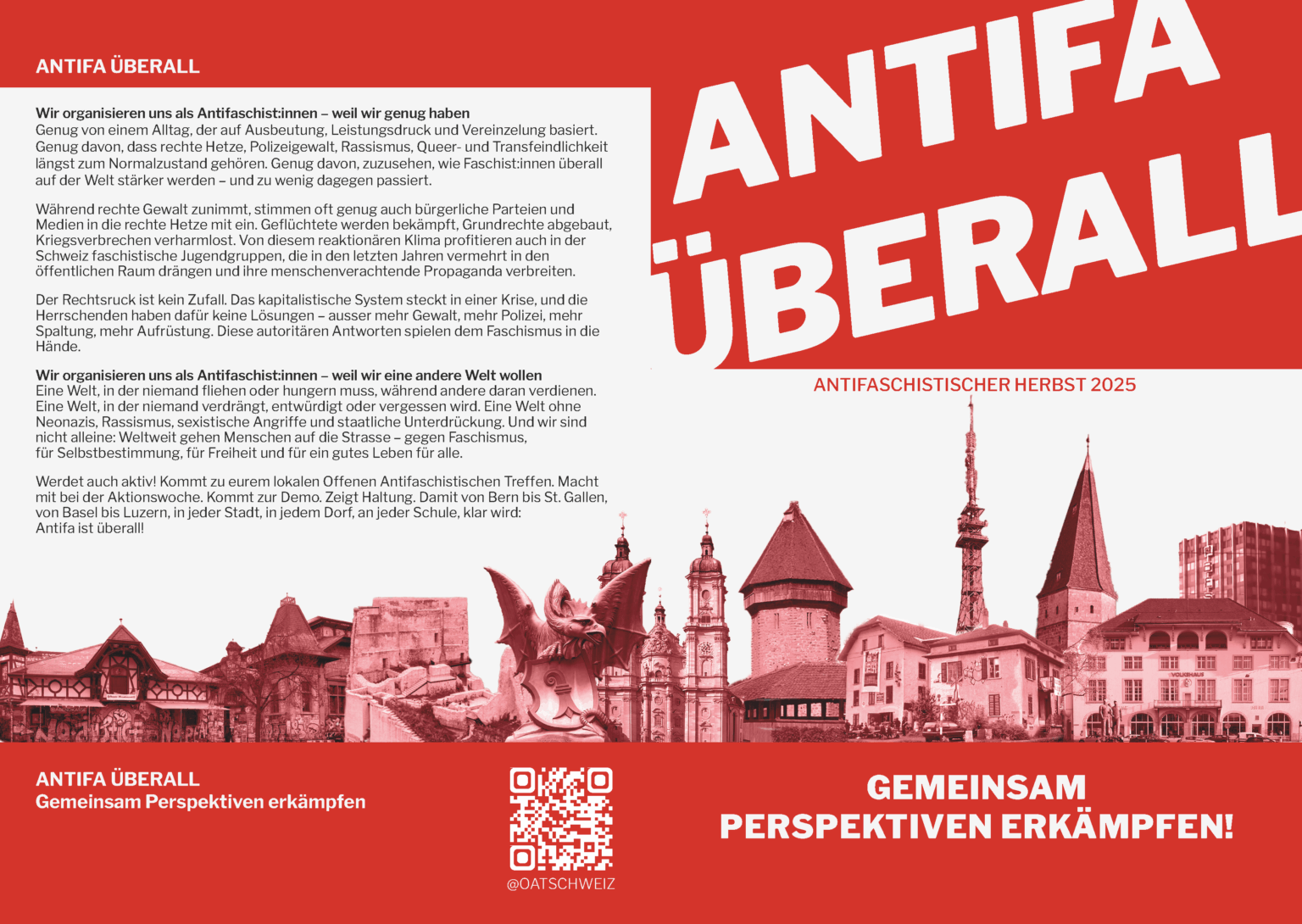 Werdet auch aktiv! Kommt zu eurem lokalen Offenen Antifaschistischen Treffen. Macht mit bei der Aktionswoche. Kommt zur Demo. Zeigt Haltung. Damit von Bern bis St. Gallen, von Basel bis Luzern, in jeder Stadt, in jedem Dorf, an jeder Schule, klar wird: Antifa ist überall!