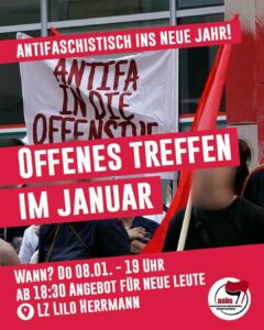 Gemeinsam wollen wir auf’s neue Jahr blicken, denn es kommt einiges auf uns zu. Landtagswahlen und militante Rechte auf den Straßen erfordern antifaschistische Antworten auf die aktuellen Entwicklungen. Gleichzeitig wollen wir auch im neuen Jahr ein linkes, antifaschistisches Kulturangebot planen und gemeinsam umsetzen.