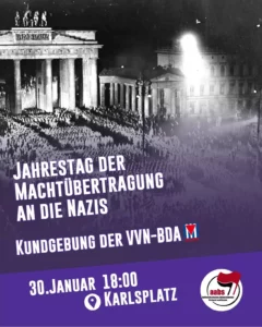 Am 30. Januar jährt sich zum 93. Mal die Machtübernahme an die deutschen Faschisten. Wir schließen uns der Kundgebung der VVN an und wollen ein gemeinamens zeichen setzen und an die Geschichte erinnern.