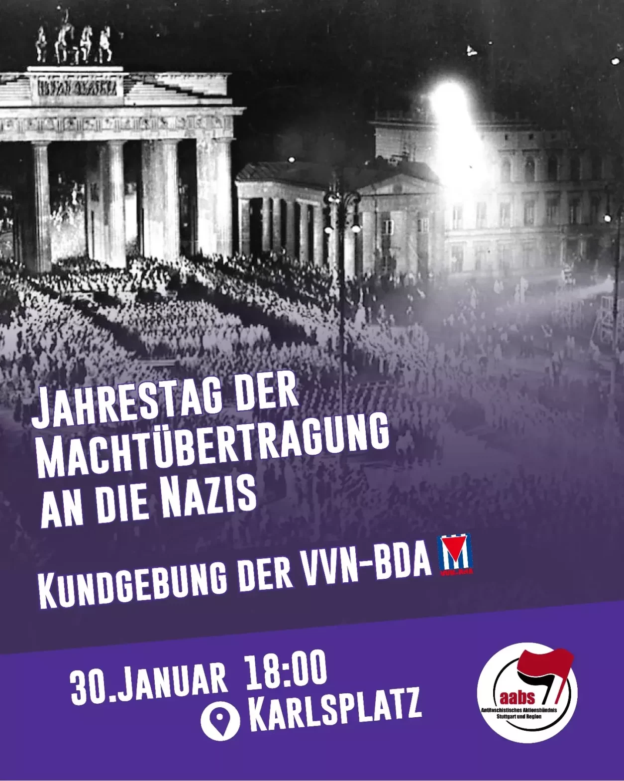 Am 30. Januar jährt sich zum 93. Mal die Machtübernahme an die deutschen Faschisten. Wir schließen uns der Kundgebung der VVN an und wollen ein gemeinamens zeichen setzen und an die Geschichte erinnern.