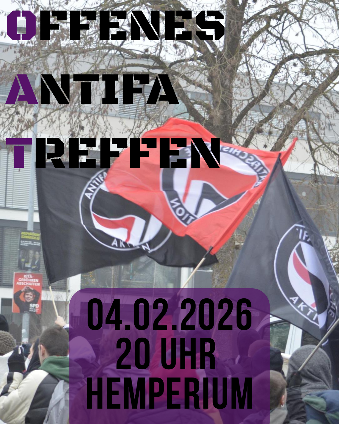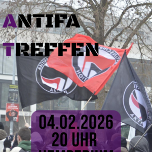 Lasst uns das antifaschistische Moment in Ulm aufrecht erhalten! Kommt zu unserem Offenen Antifa Treffen am Mittwoch 04.02. ab 20:00 im Hemperium, um untereinder zu connecten, mit uns zu quatschen oder Fascho-Memory zu spielen – diesmal wieder mit Input zum Thema “Extreme Rechte im Wahlkampf”