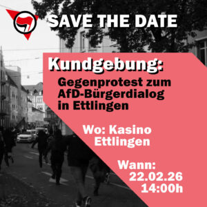 Die AfD Ettlingen lädt am 22. Februar zu einem Bürgerdialog im Kasino Ettlingen ein. Zu Gast sind Dominik Kaufner und Lena Kotré, beide Teil des faschistischen „Flügels“ um Höcke. Mit dabei ist ebenfalls Thomas Möckel aus Ettlingen, der gerne mal ein T-Shirt mit Reichsadler-Aufdruck trägt und sich mit jungen Nazis umgibt. Unter dem großen Titel „Remigration“ soll bei diesem Bürgerdialog Hass gegen Migrant:innen geschürt werden. Die Pläne der AfD, Menschen millionenfach abzuschieben, die nicht in ihre imaginäre „Volksgemeinschaft“ passen, ist spätestens seit der Correctiv-Recherche 2024 kein Geheimnis mehr. Und, falls das nicht genug ist, sagt Lena Kotré es selber ganz offen: „Wenn das Rassismus ist, dann ist es eben Rassismus, dann bin ich ein Rassist.“