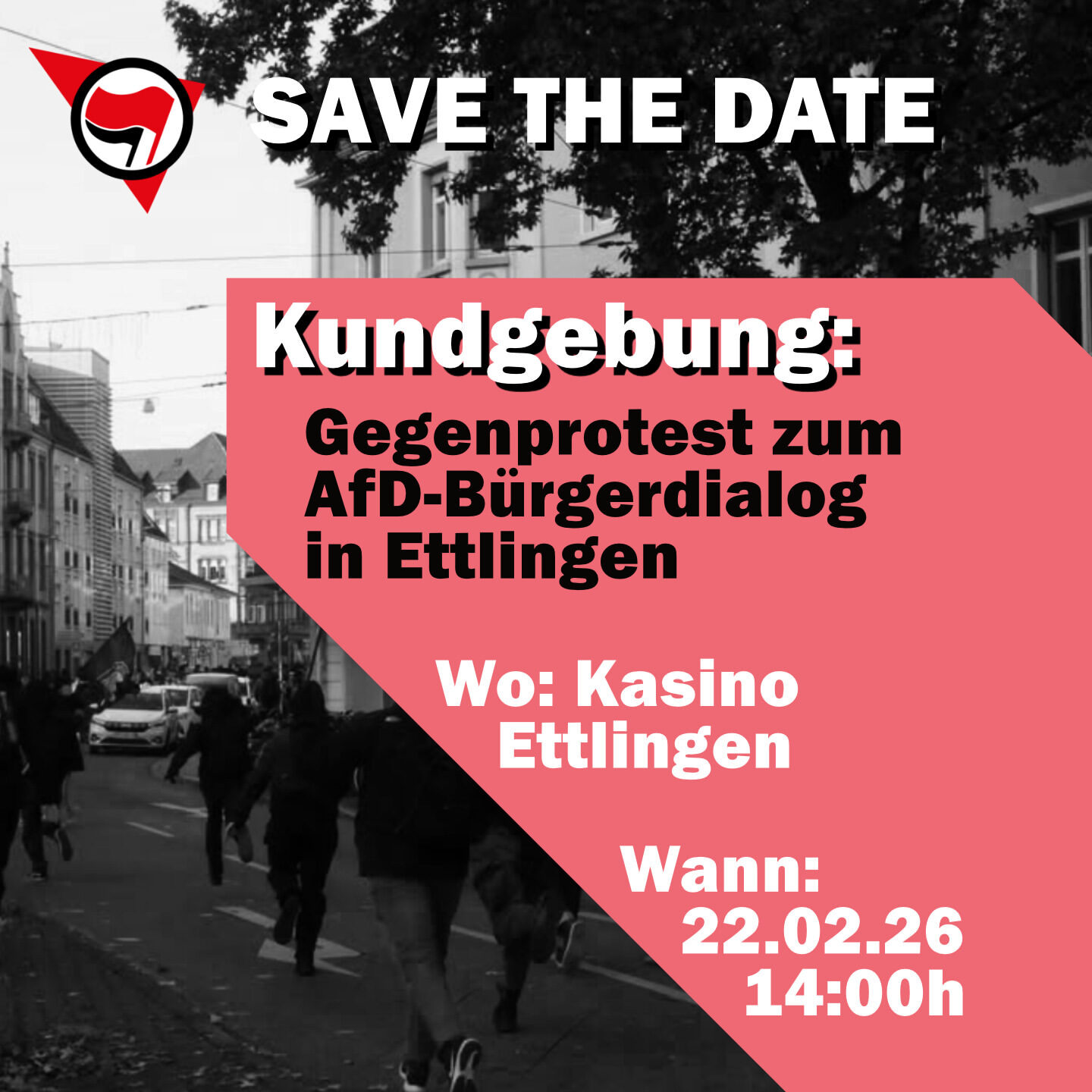 Während Reallöhne sinken, die Mieten immer teurer werden und wir einen sozialen Kahlschlag erleben, versucht die AfD uns weiszumachen, dass die Menschen, die sowieso am wenigsten haben, die vor Krieg und Elend geflohen sind, das Problem sind. Das lassen wir nicht unwidersprochen! Kommt am 22. Februar um 14 Uhr mit uns vor das Kasino in Ettlingen und protestiert gemeinsam mit uns gegen rechte Hetze und für eine solidarische Gesellschaft!