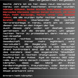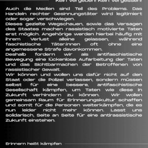 Wir können und wollen uns dafür nicht auf den Staat oder die Polizei verlassen, sondern müssen selbst für eine bessere Gesellschaft kämpfen, um Taten wie diese in Zukunft verhindern zu können. Wir wollen gemeinsam Raum für Erinnerungskultur schaffen und somit für die Personen weiterkämpfen, die es nun leider nicht mehr können. Lasst uns solidarisch, Seite an Seite für eine antirassistische Zukunft einstehen.