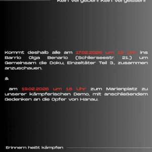 Und kommt anschließend Alle am 19.02.2026 um 18 Uhr zum Marienplatz zu unserer kämpferischen Demo, mit anschließendem Gedenken an die Opfer von Hanau.