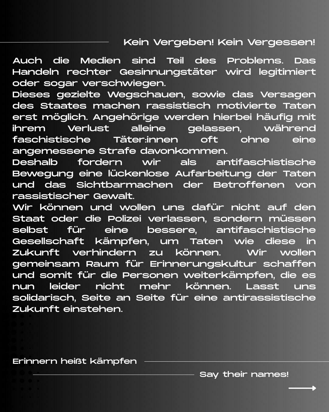 Wir können und wollen uns dafür nicht auf den Staat oder die Polizei verlassen, sondern müssen selbst für eine bessere Gesellschaft kämpfen, um Taten wie diese in Zukunft verhindern zu können. Wir wollen gemeinsam Raum für Erinnerungskultur schaffen und somit für die Personen weiterkämpfen, die es nun leider nicht mehr können. Lasst uns solidarisch, Seite an Seite für eine antirassistische Zukunft einstehen.