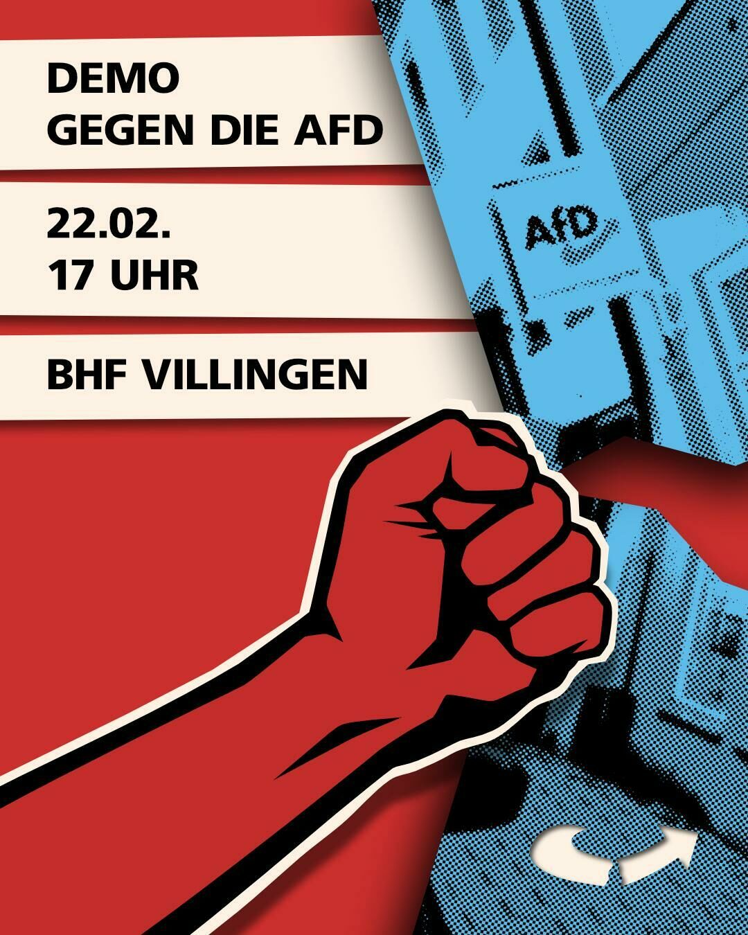 Antifaschistische Demonstration gegen die AfD Show am 22.Februar im Theater am Ring in Villingen. Die Demo geht ab 17 Uhr vom Bahnhof Villingen zur AfD im Theater am Ring.