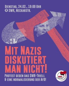 Die Einladung der AfD in ein öffentlich-rechtliches Diskussionsformat bietet der Partei eine Bühne für ihre menschenverachtenden Positionen und fördert die weitere Normalisierung der AfD innerhalb der Gesellschaft. Die Forderungen der AfD nach „Remigration“, ihr Frauen- und Queerfeindliches Weltbild, sowie die rechte Hetze dürfen nicht normalisiert werden! Wer denkt, man könne Faschist:innen durch Diskussion oder Einbindung in Realpolitik „entzaubern“ o.ä. sollte eigentlich seit 1933 gesehen haben, dass das kein guter und funktionierender Plan ist…