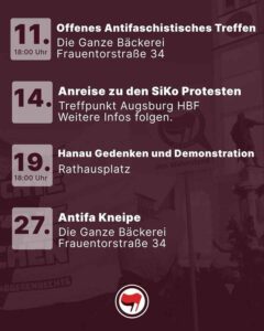 Jeden letzten Freitag im Monat laden wir ab 19 Uhr zur offenen Antifa-Kneipe alle ein, die sich für das Thema Antifaschismus interessieren. In einer entspannten Atmosphäre bieten wir Raum, sich über aktuelle Themen auszutauschen oder uns und unsere Arbeit besser kennenzulernen. Für das leibliche Wohl ist mit veganer Küche und kühlen Getränken gesorgt. Kommt vorbei!