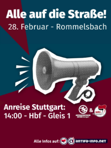 Am 28. Februar lädt die Reutlinger AfD Björn Höcke zur Wahlkampfveranstaltung ein. Im Rommelsbacher Schulzentrum will er mit erwarteten mehreren Hundert Anhänger:innen die Stimmungsmache von Rechts im Ländle unterstützen. Für uns ist klar: Das passiert nicht ohne unseren antifaschistischen Protest. Wir schließen uns dem Aufruf der Antifaschistischen Aktion Süd und dem Protest vom Bündnis „Gemeinsam und Solidarisch gegen Rechts in Tübingen/Reutlingen“ an und rufen auf: Schließt euch unserer Anreise aus Stuttgart an, damit wir Höcke und Co. gemeinsam zeigen können, dass sie mit ihrer rechten Politik nicht in unser Weltbild passen!
