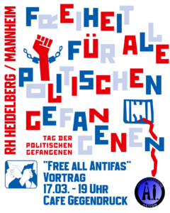 Anlässlich des Tags der politischen Gefangenen (18. März) informieren wir am Dienstag, 17. März 2026 gemeinsam mit der Roten Hilfe HD/MA beim Vortrag „Free all Antifas!“ Antifaschist*innen in deutschen Knästen. Beginn ist um 19 Uhr im Café Gegendruck (Fischergasse 2, HD-Altstadt).