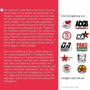 Seit ihrer Eröffnung in den 1960er-Jahren ist die Justizvollzugsanstalt im Stuttgarter Stadtteil Stammheim ein Symbol für politische Repression. Aktuell sind dort unter Anderem Mehmet, Walt und Walat aus der Kurdistan- und Palästinasolidarischen Bewegung inhaftiert. Am Tag der politischen Gefangenen, dem 18. März, möchten wir dort eine Kundgebung durchführen. Gegen die Kriminalisierung politischer Bewegungen und für die Freiheit aller politischen Gefangenen.