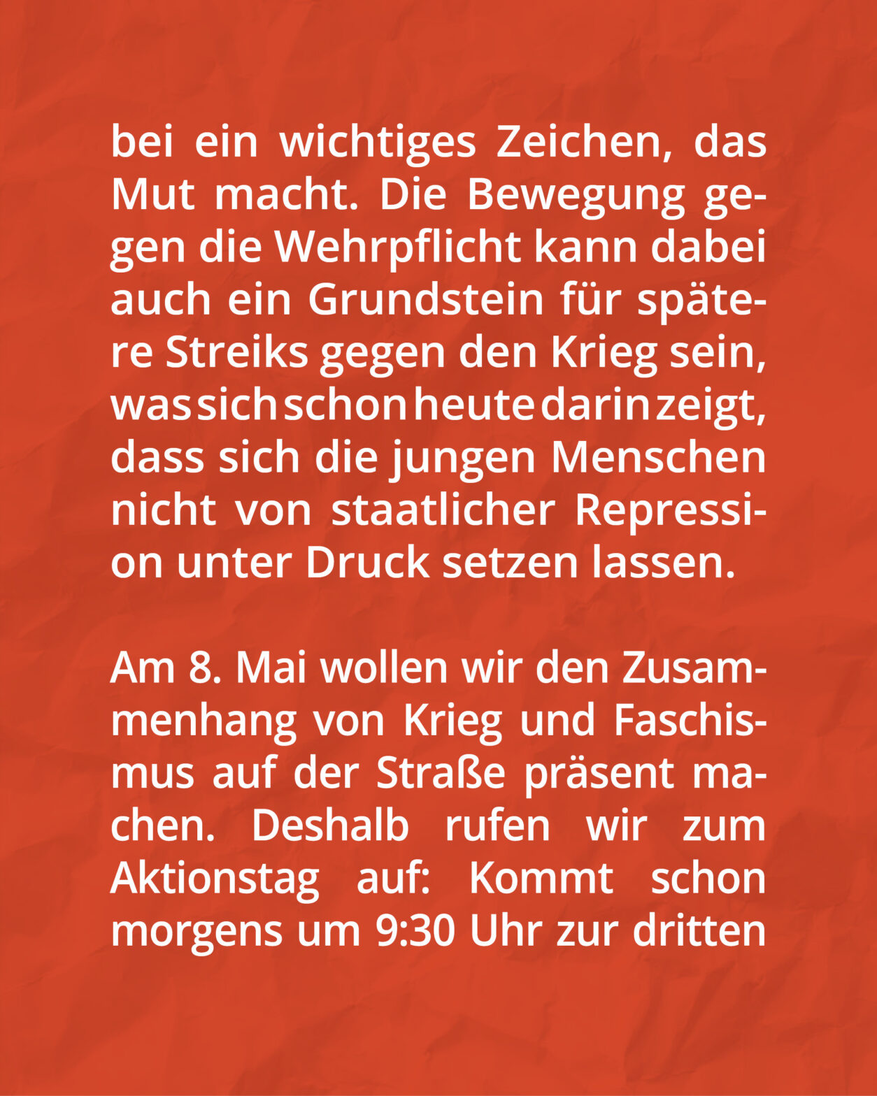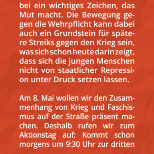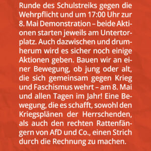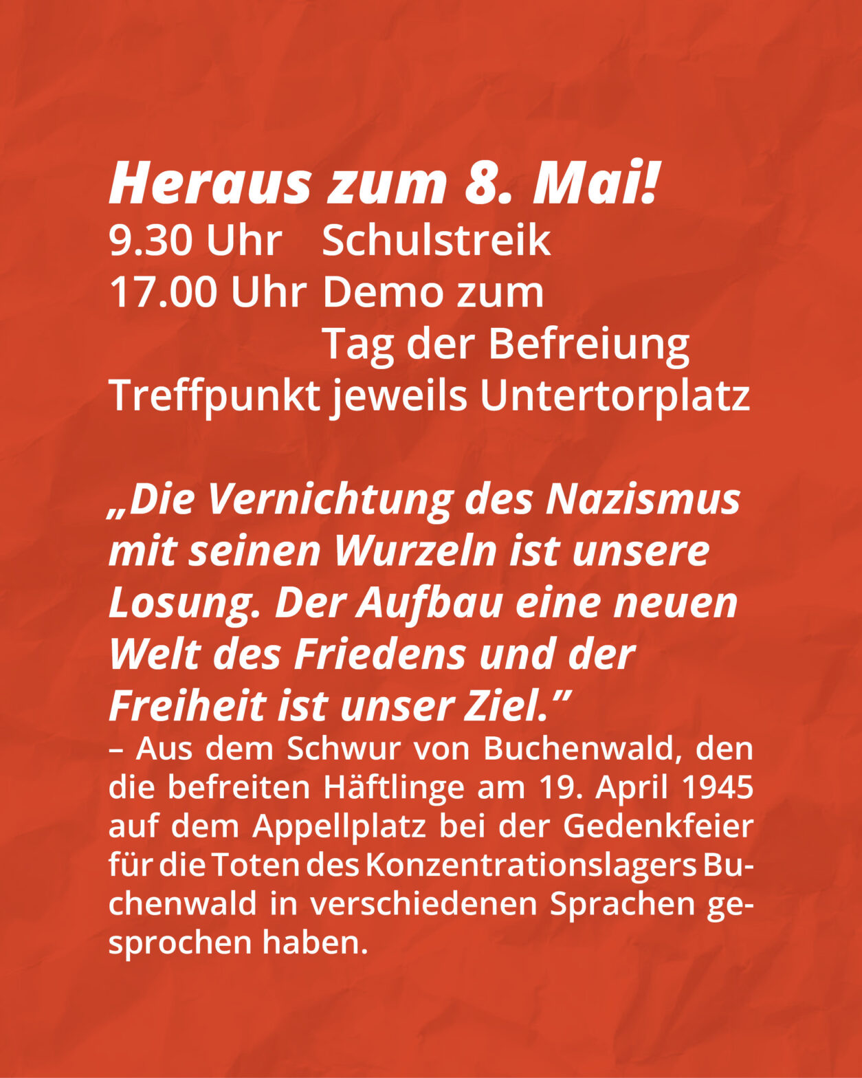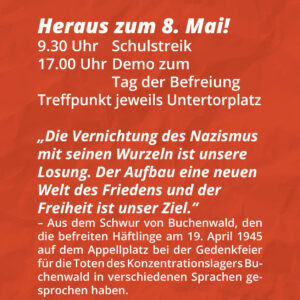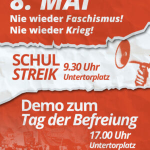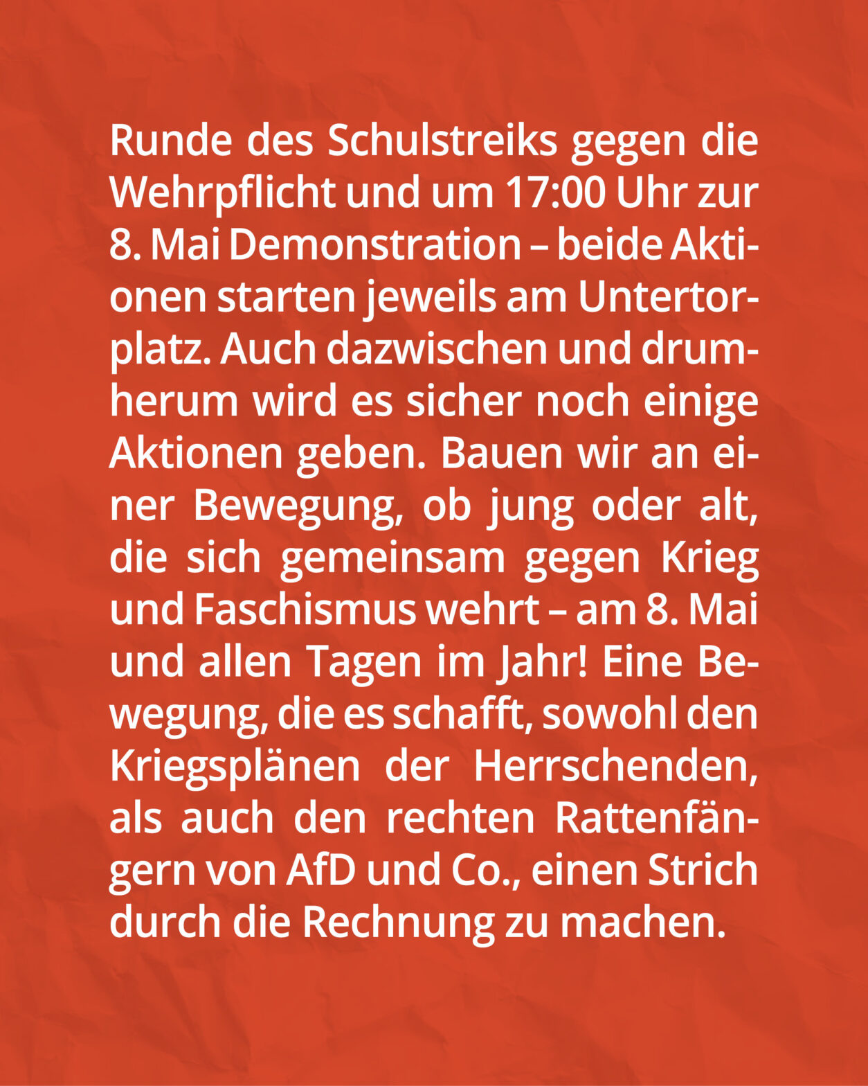Am 8. Mai wollen wir den Zusammenhang von Krieg und Faschismus auf der Straße präsent machen. Deshalb rufen wir zum Aktionstag auf: Kommt schon morgens um 9:30 Uhr zur dritten Runde des Schulstreiks gegen die Wehrpflicht und um 17:00 Uhr zur 8. Mai Demonstration – beide Aktionen starten jeweils am Untertorplatz. Auch dazwischen und drumherum wird es sicher noch einige Aktionen geben. Bauen wir an einer Bewegung, ob jung oder alt, die sich gemeinsam gegen Krieg und Faschismus wehrt – am 8. Mai und allen Tagen im Jahr! Eine Bewegung, die es schafft, sowohl den Kriegsplänen der Herrschenden, als auch den rechten Rattenfängern von AfD und Co., einen Strich durch die Rechnung zu machen.