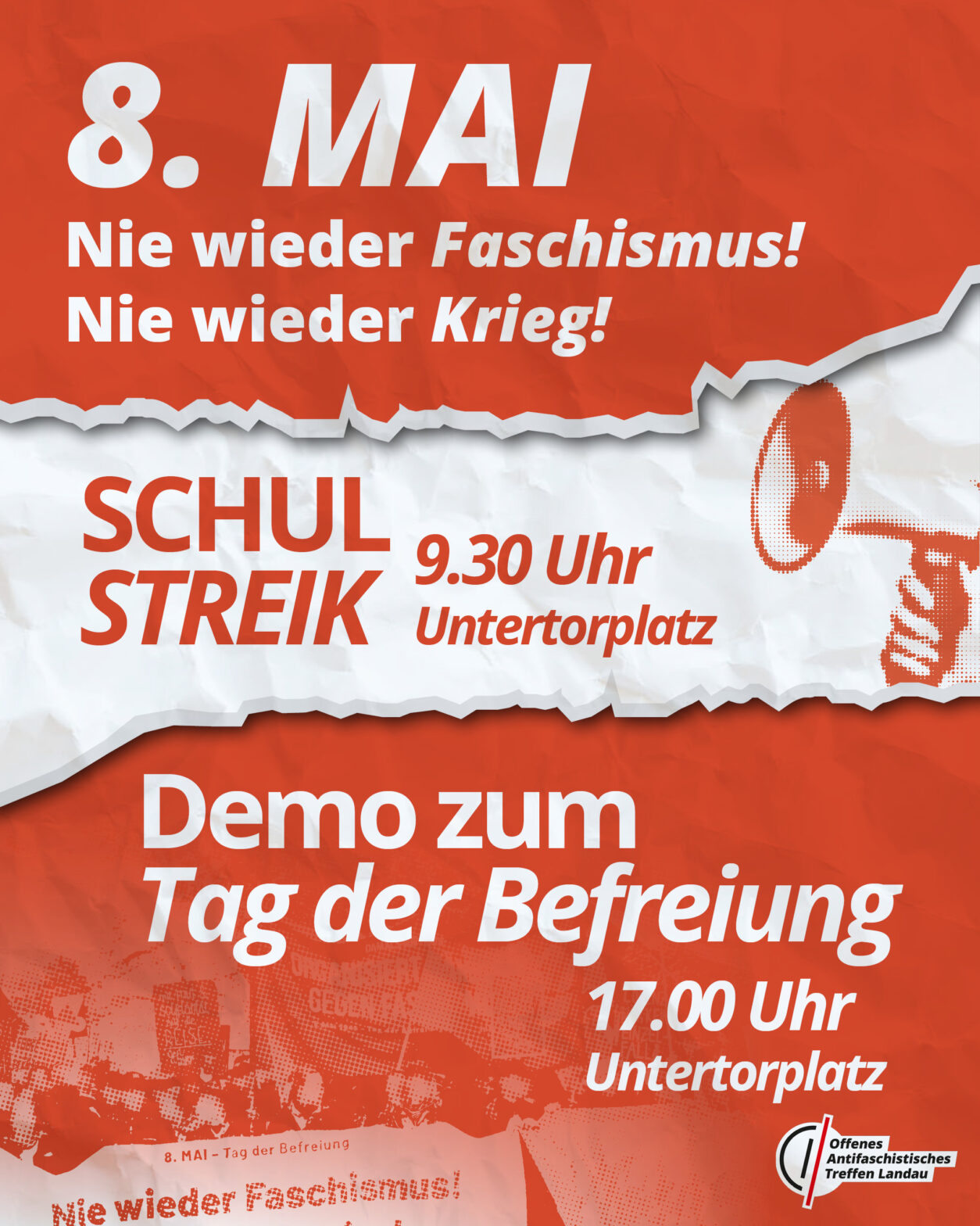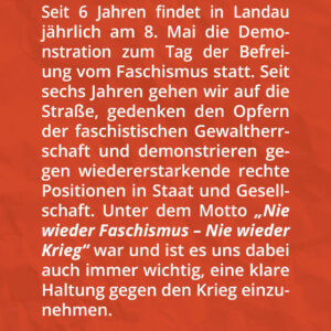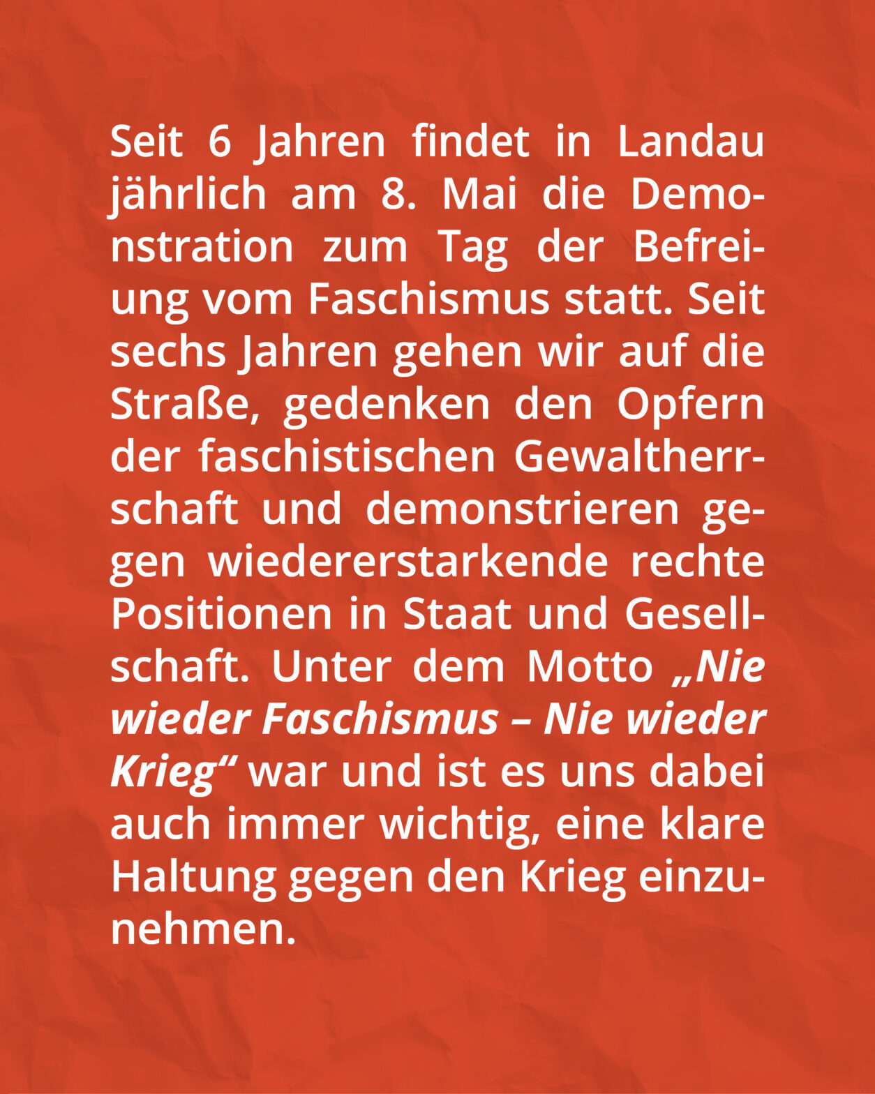 Seit sechs Jahren findet in Landau jährlich am 8. Mai die Demonstration zum Tag der Befreiung vom Faschismus statt. Seit sechs Jahren gehen wir auf die Straße, gedenken den Opfern der faschistischen Gewaltherrschaft und demonstrieren gegen wiedererstarkende rechte Positionen in Staat und Gesellschaft. Unter dem Motto „Nie wieder Faschismus – Nie wieder Krieg“ war und ist es uns dabei auch immer wichtig, eine klare Haltung gegen den Krieg einzunehmen.