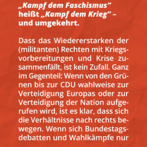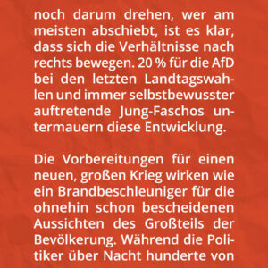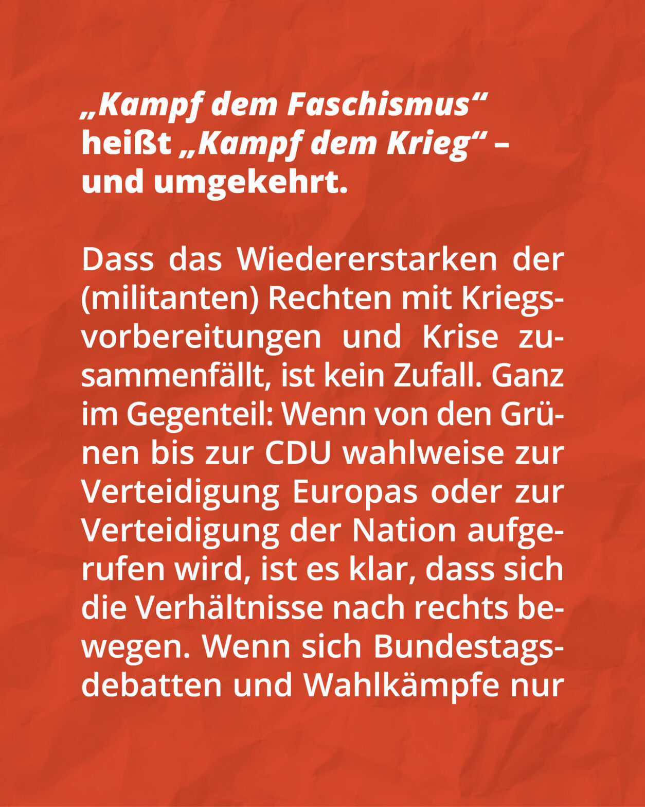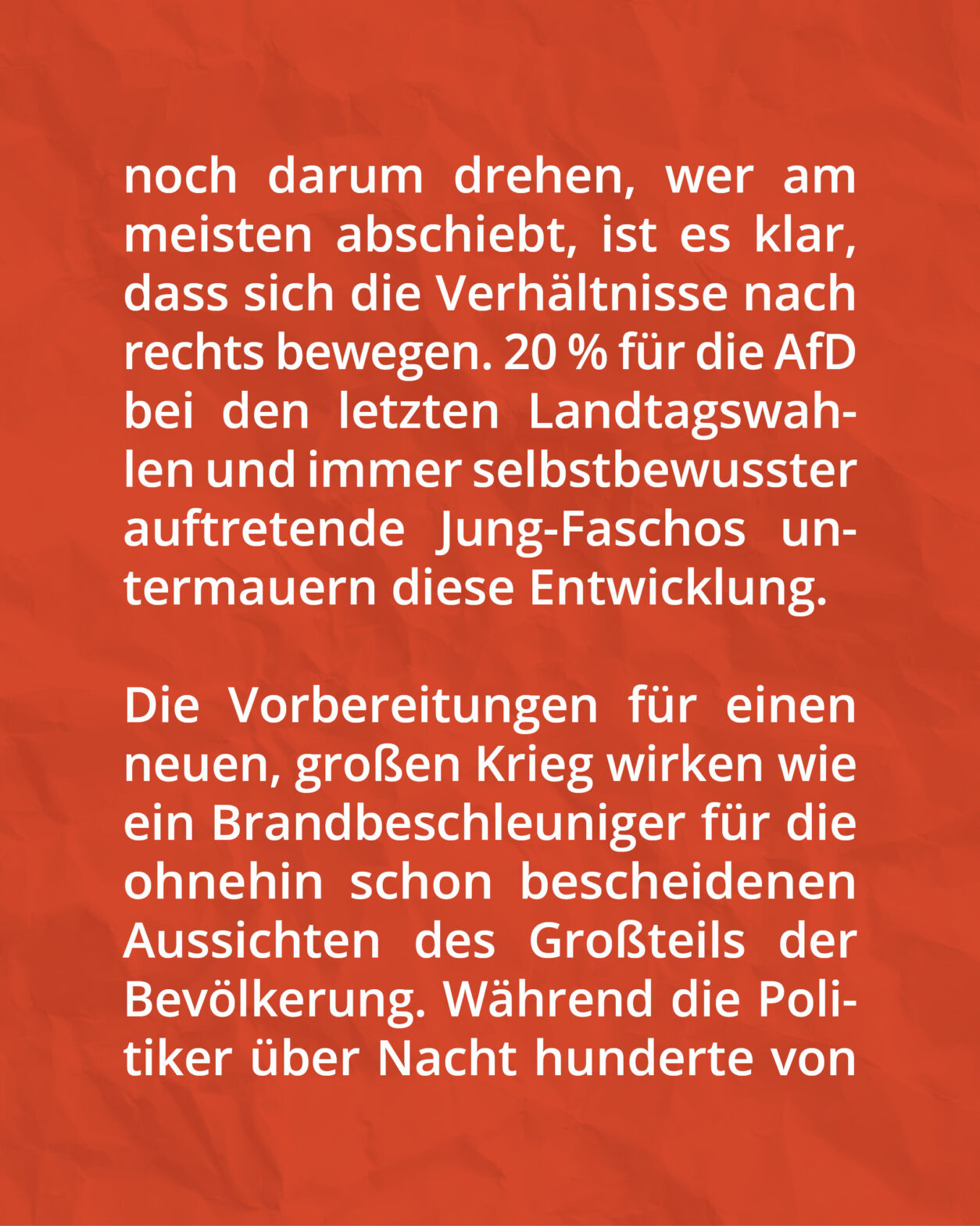 Dass das Wiedererstarken der (militanten) Rechten mit Kriegsvorbereitungen und Krise zusammenfällt, ist kein Zufall. Ganz im Gegenteil: Wenn von den Grünen bis zur CDU wahlweise zur Verteidigung Europas oder zur Verteidigung der Nation aufgerufen wird, ist es klar, dass sich die Verhältnisse nach rechts bewegen. Wenn sich Bundestagsdebatten und Wahlkämpfe nur noch darum drehen, wer am meisten abschiebt, ist es klar, dass sich die Verhältnisse nach rechts bewegen. 20 % für die AfD bei den letzten Landtagswahlen und immer selbstbewusster auftretende Jung-Faschos untermauern diese Entwicklung.