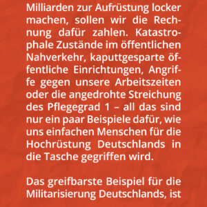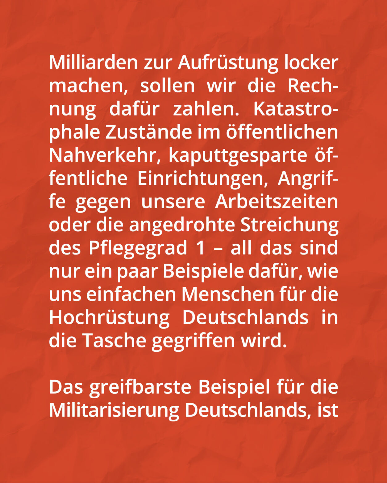 Die Vorbereitungen für einen neuen, großen Krieg wirken wie ein Brandbeschleuniger für die ohnehin schon bescheidenen Aussichten des Großteils der Bevölkerung. Während die Politiker über Nacht hunderte von Milliarden zur Aufrüstung locker machen, sollen wir die Rechnung dafür zahlen. Katastrophale Zustände im öffentlichen Nahverkehr, kaputtgesparte öffentliche Einrichtungen, Angriffe gegen unsere Arbeitszeiten oder die angedrohte Streichung des Pflegegrad 1 – all das sind nur ein paar Beispiele dafür, wie uns einfachen Menschen für die Hochrüstung Deutschlands in die Tasche gegriffen wird.