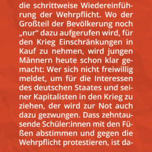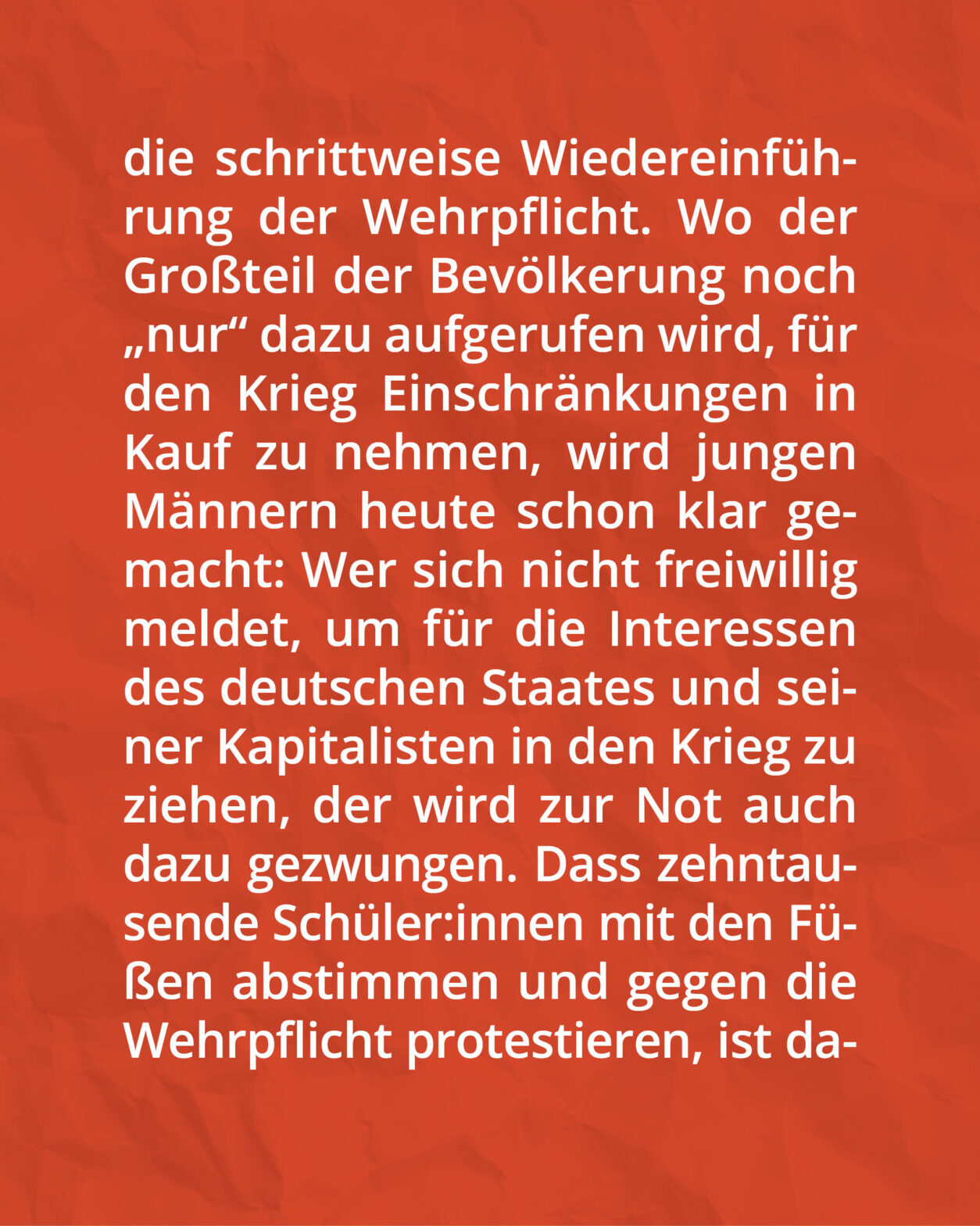 Das greifbarste Beispiel für die Militarisierung Deutschlands, ist die schrittweise Wiedereinführung der Wehrpflicht. Wo der Großteil der Bevölkerung noch „nur“ dazu aufgerufen wird, für den Krieg Einschränkungen in Kauf zu nehmen, wird jungen Männern heute schon klar gemacht: Wer sich nicht freiwillig meldet, um für die Interessen des deutschen Staates und seiner Kapitalisten in den Krieg zu ziehen, der wird zur Not auch dazu gezwungen. Dass zehntausende Schüler:innen mit den Füßen abstimmen und gegen die Wehrpflicht protestieren, ist dabei ein wichtiges Zeichen, das Mut macht. Die Bewegung gegen die Wehrpflicht kann dabei auch ein Grundstein für spätere Streiks gegen den Krieg sein, was sich schon heute darin zeigt, dass sich die jungen Menschen nicht von staatlicher Repression unter Druck setzen lassen.