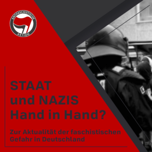 Diese Broschüre, die 2019 von mehreren antifaschistischen Gruppen aus Süddeutschland veröffentlicht wurde, zeichnet die Verstrickungen des Staates mit faschistischen Strukturen nach. Die Broschüre beschreibt die Funktion des Faschismus an der Macht und von faschistischen Bewegungen für das Kapital und erklärt anhand dieser Analyse den Umgang des Staates mit faschistischen Strukturen wie dem NSU und Nordkreuz. Zudem wird der Aufstieg der AfD in den gesellschaftlichen Kontext eingeordnet.